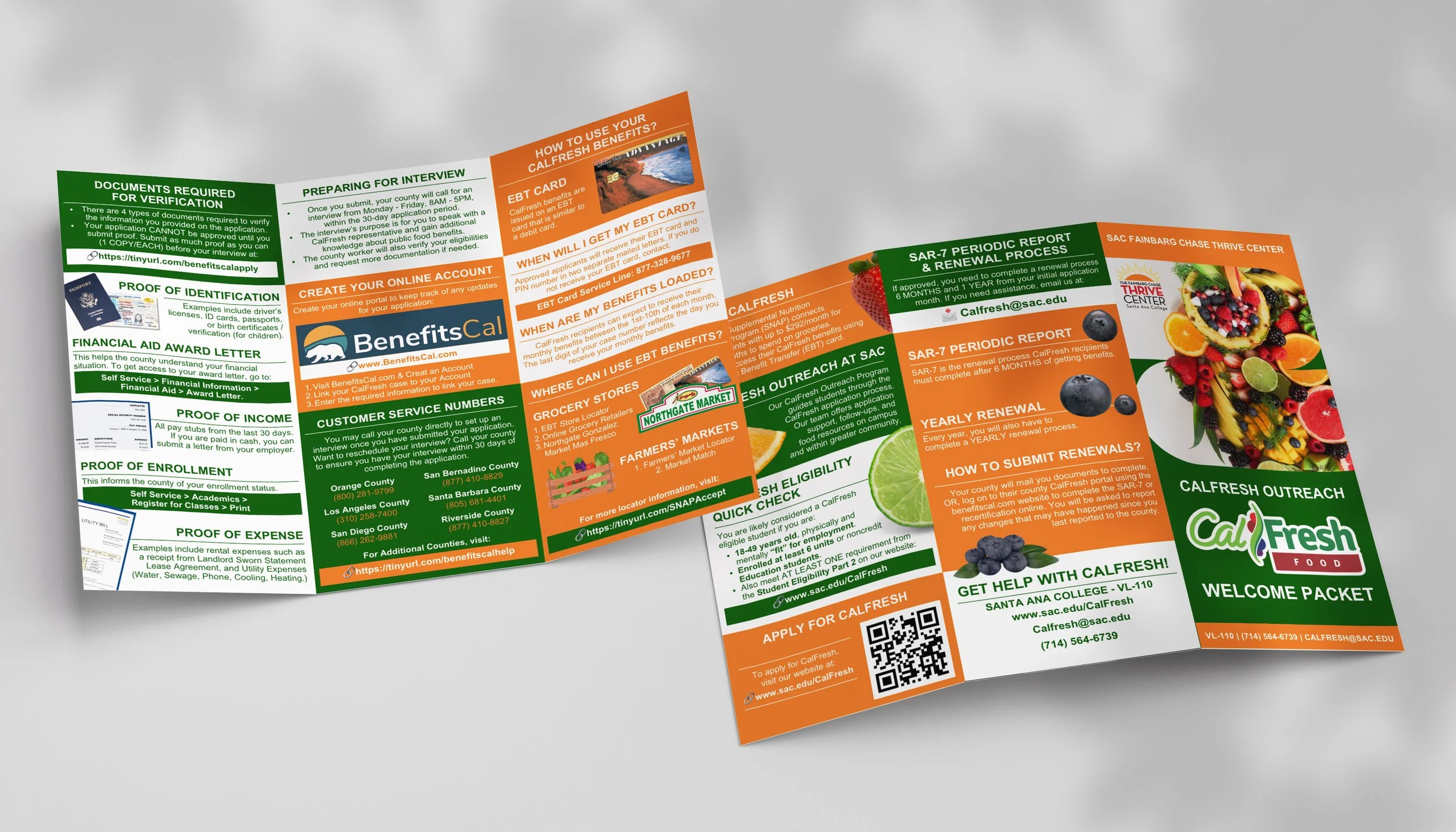 This trifold brochure was created to promote the CalFresh program at Santa Ana College, helping students access monthly food benefits that support their well-being and academic success. Because the program involves many steps, documents, and guidelines, I focused on condensing a large amount of information into a single, easy-to-navigate resource. Using a fresh green and orange color palette paired with vibrant produce imagery, the design guides readers through eligibility, verification requirements, interview preparation, and renewal processes without overwhelming them. The goal was to make essential information approachable and empower students to feel confident as they begin or continue their CalFresh application.